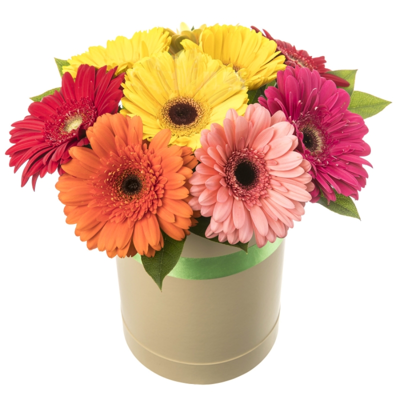 Букет состоит из MIX из 9 гербер, салал, коробка, атласная лента.
