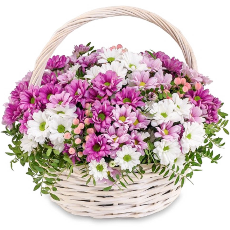 MIX из 19 веток хризантем, 5 гиперикум, зелень, корзина.