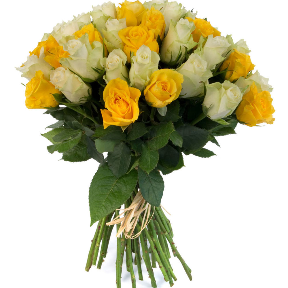 Букет состоит из 23 желтые розы, 22 белые розы, прозрачная упаковка, атласная лента.