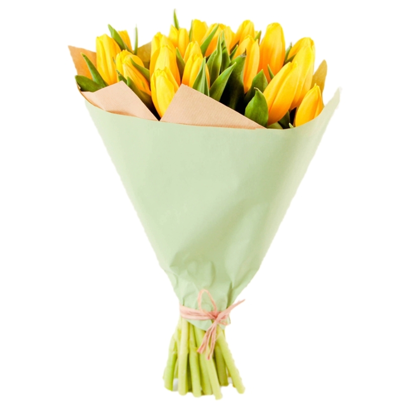 Букет состоит из 21 желтый тюльпан, крафт, атласная лента.