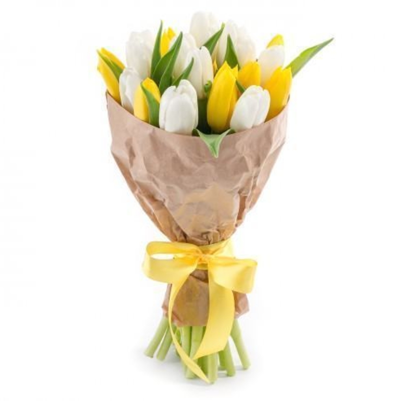 Букет состоит из 8 желтых тюльпанов, 7 белых тюльпанов, крафт, атласная лента.