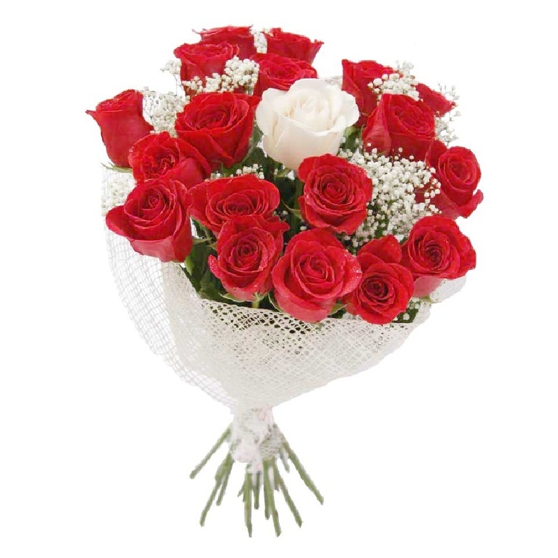 Букет состоит из 18 красных роз, 1 белая роза, 2 ветки гипсофилы, красивая упаковка, атласная лента.